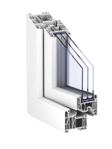 Die nach modernsten Berechnungsmethoden konstruierten Kammern sorgen für hohe Wärme- und Schalldämmung sowie für optimale Stabilität des Profils und hohe Tragkraft bei schweren Gläsern. 6 Kammer Profil, Bautiefe 76 mm. Hohe Formstabilität -Spezielle Anlagepunkte halten die Stahlverstärkung in der richtigen Position. Optimaler Schallschutz von bis zu 48 dB durch innovative Dichtungen.